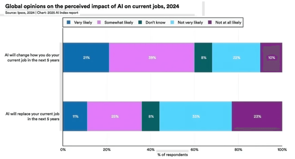 Immerhin 36 Prozent der von Ipsos Befragten halten es für wahrscheinlich, dass KI in den nächsten fünf Jahren ihren derzeitigen Arbeitsplatz ersetzen wird. 56 Prozent halten dies für unwahrscheinlich, während 8 Prozent unentschieden sind. 60 Prozent der Befragten erwarten, dass KI ihre Arbeit in irgendeiner Weise verändern wird.