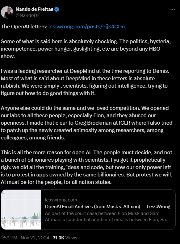 Der ehemalige DeepMind-Spitzenforscher Nando de Freitas hat auf der Plattform X die in den E-Mails enthaltenen Vorwürfe gegen DeepMind scharf zurückgewiesen. "Das meiste, was in diesen Briefen über DeepMind gesagt wird, ist absoluter Unsinn. Wir waren einfach Wissenschaftler, die versuchten, Intelligenz zu verstehen und Gutes damit zu bewirken", schreibt de Freitas.