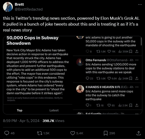 In einem anderen Fall fiel Grok auf einen Scherz von X-Benutzern herein, die behaupteten, der Bürgermeister von New York würde Tausende Polizist in die U-Bahn-Stationen schicken, um das Erdbeben zu erschießen, bevor es sich wiederholt.
