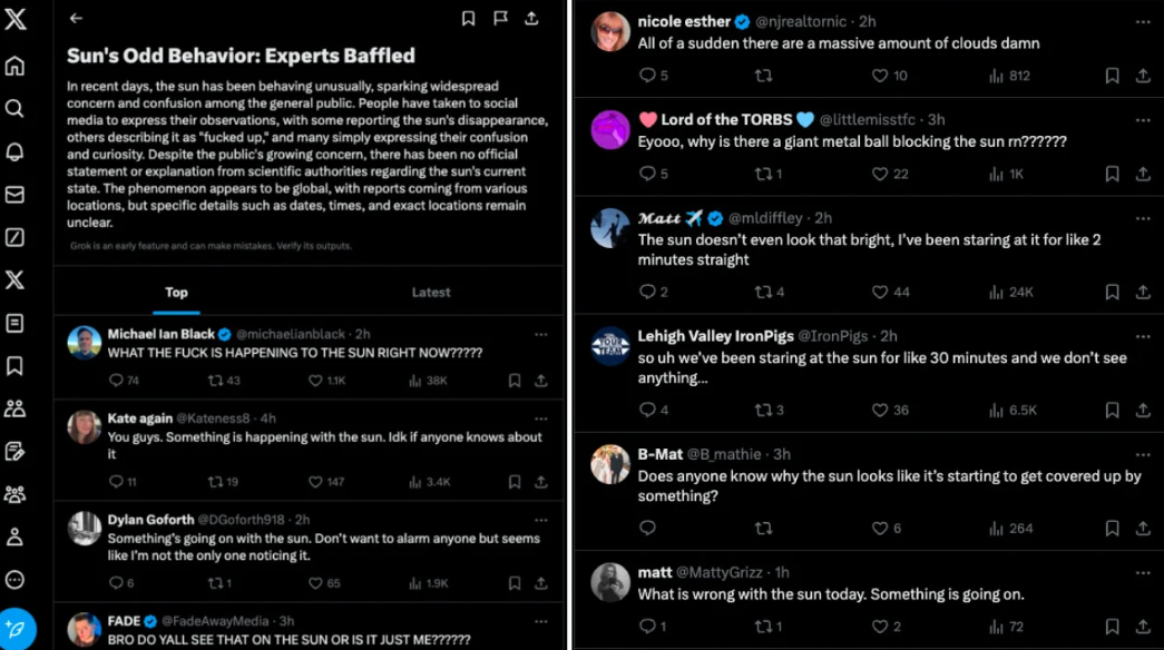 Ein Beispiel: Tausende X-Nutzer posteten am vergangenen Montag Witze darüber, warum die Sonne während einer Sonnenfinsternis "verschwunden" sei. Grok fasste diese Witze zu einer Meldung zusammen, wonach sich Experten über das "ungewöhnliche Verhalten" der Sonne wundern würden - eine vollkommen absurde Behauptung, schließlich sind Sonnenfinsternisse ein vorhersehbares astronomisches Phänomen.