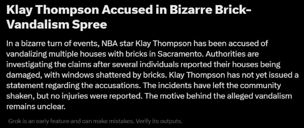 X-Nutzer sprachen daraufhin metaphorisch davon, dass Thompson "Ziegelsteine werfe", im Sinne von Fehlwürfen. Grok machte daraus die Geschichte, dass Thompson Häuser in Sacramento mit Ziegelsteinen beschädige und platzierte die fehlerhafte Meldung auf Platz fünf der Trending-Liste.