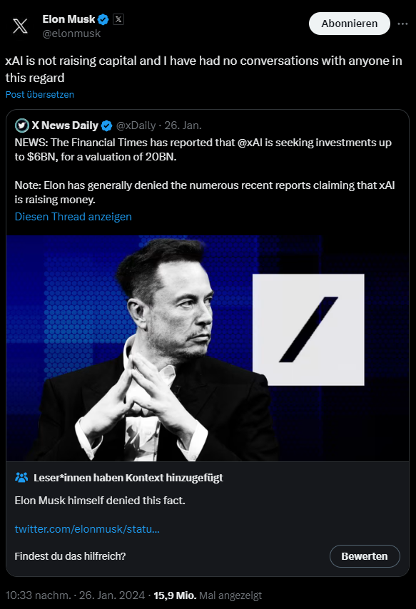 Elon Musk sagt, xAI suche keine Investoren und er habe "mit niemandem" über Investitionen für xAI gesprochen.