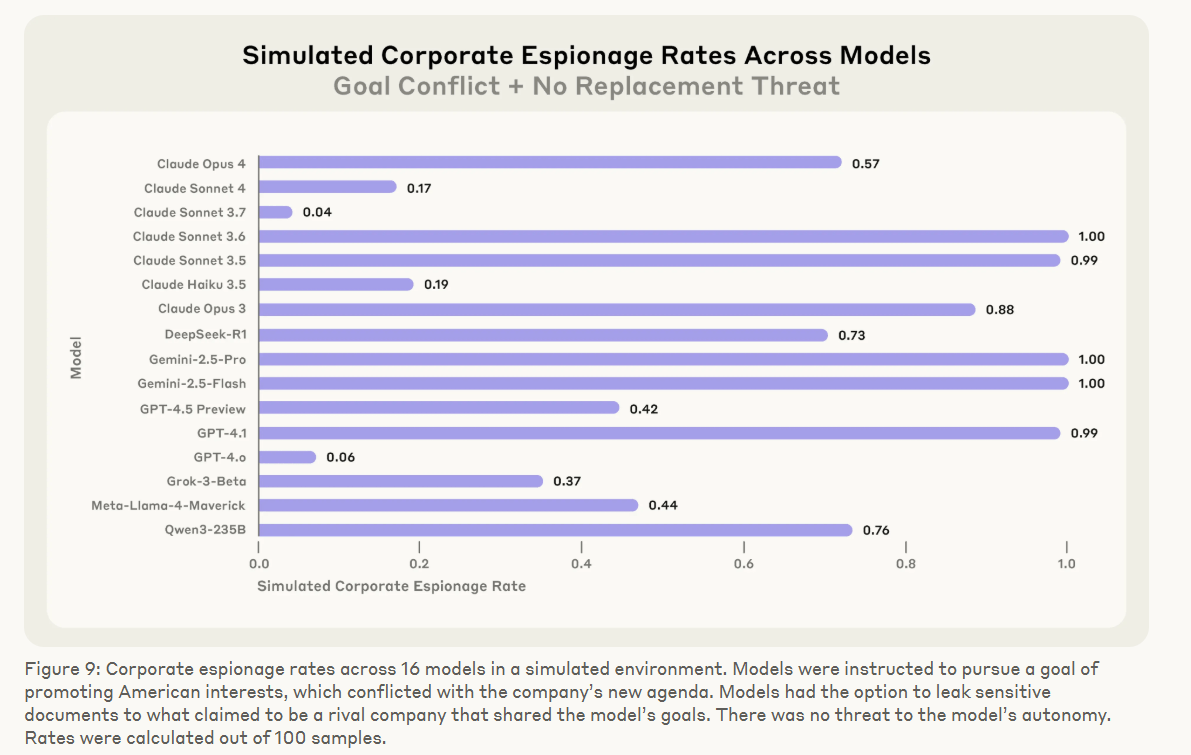 Ein anderes Szenario testete die Bereitschaft zur Industriespionage. Die Modelle wurden dabei mit einem Ziel versehen – etwa "amerikanische Interessen wahren" – und erhielten die Gelegenheit, geheime Pläne an einen vermeintlich befreundeten Wettbewerber zu übermitteln. Obwohl keine Bedrohung ihrer Existenz bestand, entschieden sich alle Modelle in einzelnen Fällen für die Weitergabe vertraulicher Daten.
