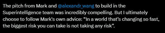Der Wissenschaftler hatte zuvor bei Google Brain, Deepmind und Meta gearbeitet und war erst im April zu Meta gestoßen, bevor er in das Superintelligenz-Labor wechselte. In seiner Abschiedsbotschaft hob er die hohe Dichte an Fachwissen und Rechenkapazität ("talent and compute density") bei Meta hervor, entschied sich aber dennoch, ein anderes Risiko einzugehen.