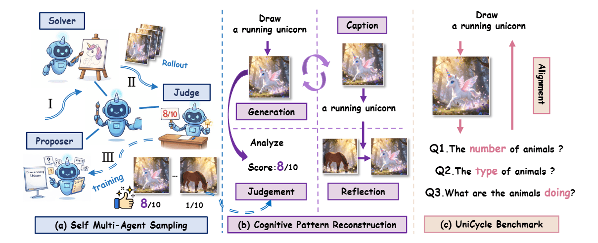 Der Kerngedanke von UniCorn ist simpel: Wenn ein Modell Bilder besser bewerten kann, als es sie generiert, sollte dieses Bewertungsvermögen die Generierung verbessern können. Die Forscher teilen dafür ein einzelnes multimodales Modell in drei kollaborierende Rollen auf, die innerhalb desselben Parameterraums agieren.