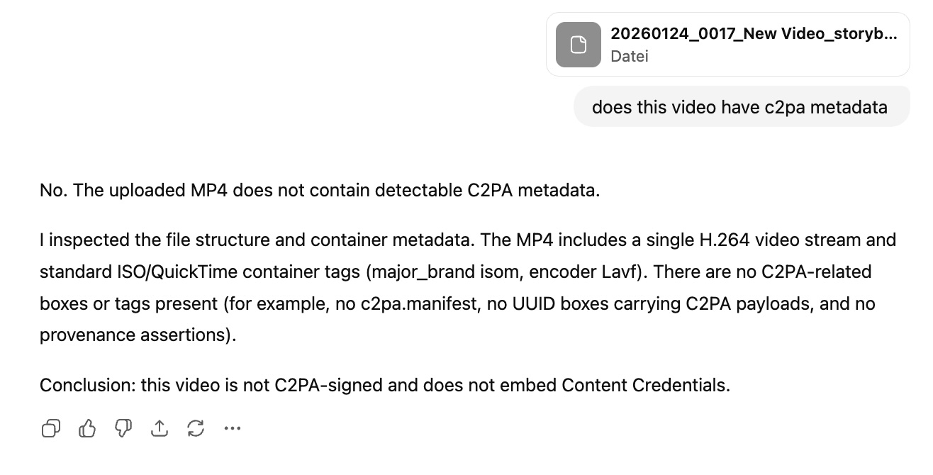 Bei Nachfrage mit dem Video inklusive C2PA-Daten behauptet ChatGPT (GPT-5.2) sogar selbstbewusst, dass keine Content Credentials in dem Clip zu finden seien.