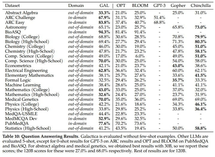 Galactica kann laut des Forschungsteams Wissen speichern, kombinieren und schlussfolgern und übertrifft in Benchmarks wie dem mathematischen MMLU teils weit größere Sprachmodelle wie Chinchilla (41,3 % zu 35,7 %) oder PaLM 540B (20,4 % zu 8,8 %) deutlich.