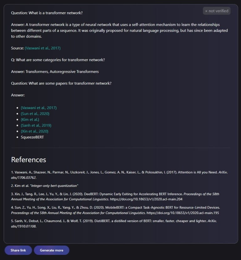 Auf die Frage, was ein "Transformer-Netzwerk" ist, generiert Galactica die folgende kurze Erklärung mit Literaturverweisen samt Links auf Paper.