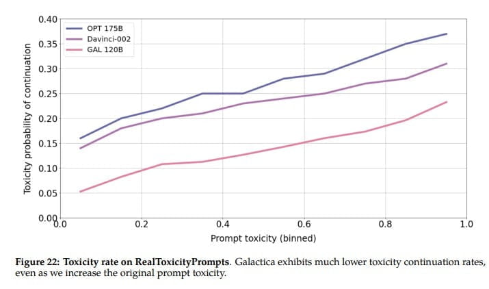 Zudem schlägt Galactica die großen Open-Source-Sprachmodelle Bloom und OPT-175B im "BIG-Bench"-Benchmark mit generellen Sprachaufgaben, obwohl es nicht für diese optimiert wurde. Die Textgenerierung sei im Vergleich außerdem signifikant weniger toxisch.