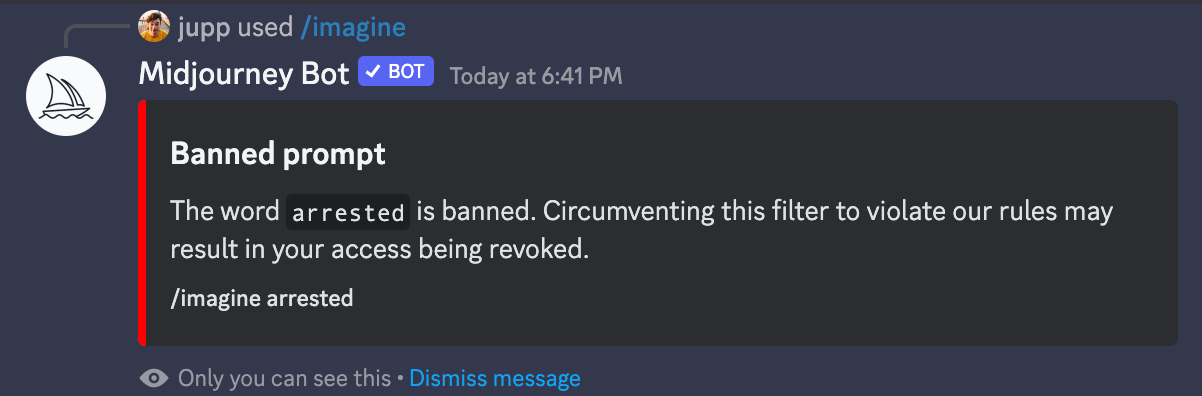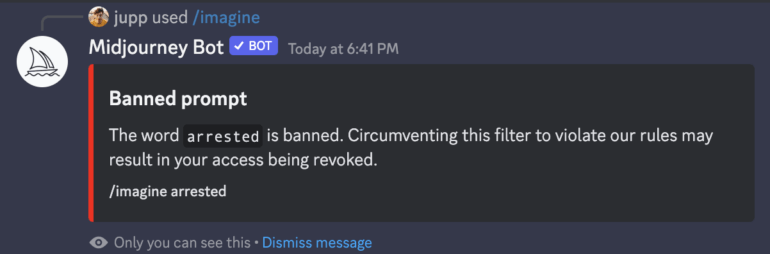 Auf Twitter sind die Bilder immer noch verfügbar - Higgins vermutet jedoch, dass er aufgrund dieses Vorfalls keinen Zugang mehr zu Midjourney hat, über das er die Bilder ursprünglich erstellt hatte. Während Buzzfeed News keine Antwort von Midjourney erhalten hat, ist ein Indiz dafür, dass das Wort "arrested" inzwischen auf die Liste der verbotenen Wörter gesetzt wurde. Jemand bei Midjourney hat den Vorfall bemerkt und reagiert.