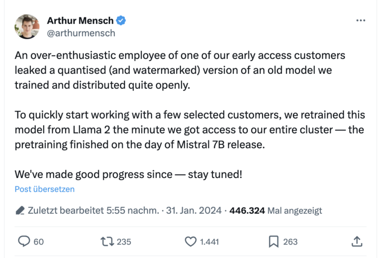 Nach vielen Spekulationen bestätigte Mistral CEO Arthur Mensch gestern auf X, dass ein "übereifriger Mitarbeiter" eines frühen Kunden eine quantisierte und mit Wasserzeichen versehene Version eines alten von Mistral trainierten Modells veröffentlicht hat. Laut Mensch handelt es sich um ein altes Modell, dass das Unternehmen auf Basis von Metas Llama 2 trainiert hat. Das Vortraining des Modells sei zum Zeitpunkt der Veröffentlichung von Mistral-7B, dem ersten Sprachmodell des Unternehmens, abgeschlossen worden. Manche hatten spekuliert, Mistral selbst habe das Modell geleakt, nachdem das Pariser KI-Startup sein letztes Mixtral-Modell zuerst via Torrent veröffentlicht hatte.