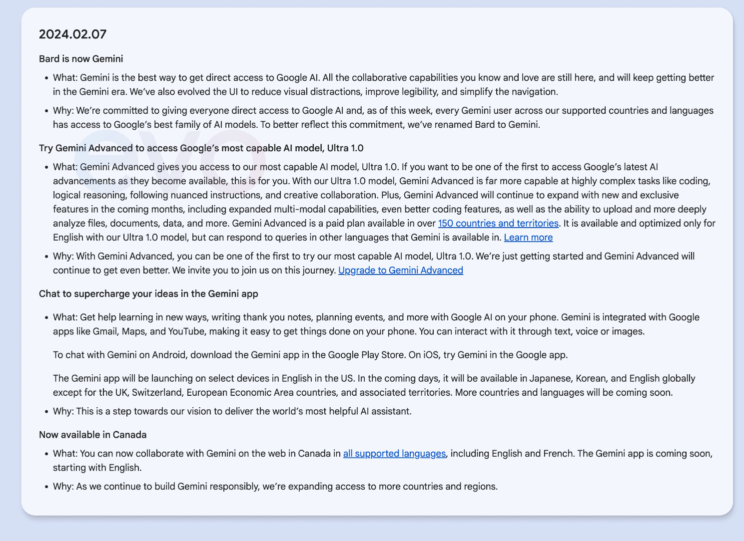 Offenbar hat Google zwischenzeitlich die Domain gemini.google.com zu früh live geschaltet und der nächste, dann nicht mehr "Bard"-Changelog ist durchgesickert: Er bestätigt die Umbenennung von Bard in Gemini ab dem 7. Februar 2024.