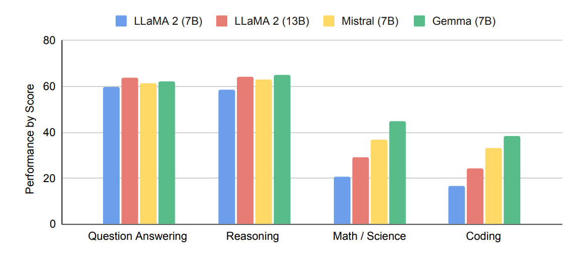 Laut dem technischen Bericht von Google übertrifft Gemma in 11 von 18 textbasierten Aufgaben ähnlich große, offene Modelle wie LLaMA 2 mit 7 und 13 Milliarden Parametern sowie Mistral-7B. Der größte Vorsprung ist in den Bereichen Mathematik und Coding zu beobachten, auch wenn hier zu größeren Modellen insgesamt noch viel Luft nach oben zu sein scheint.
