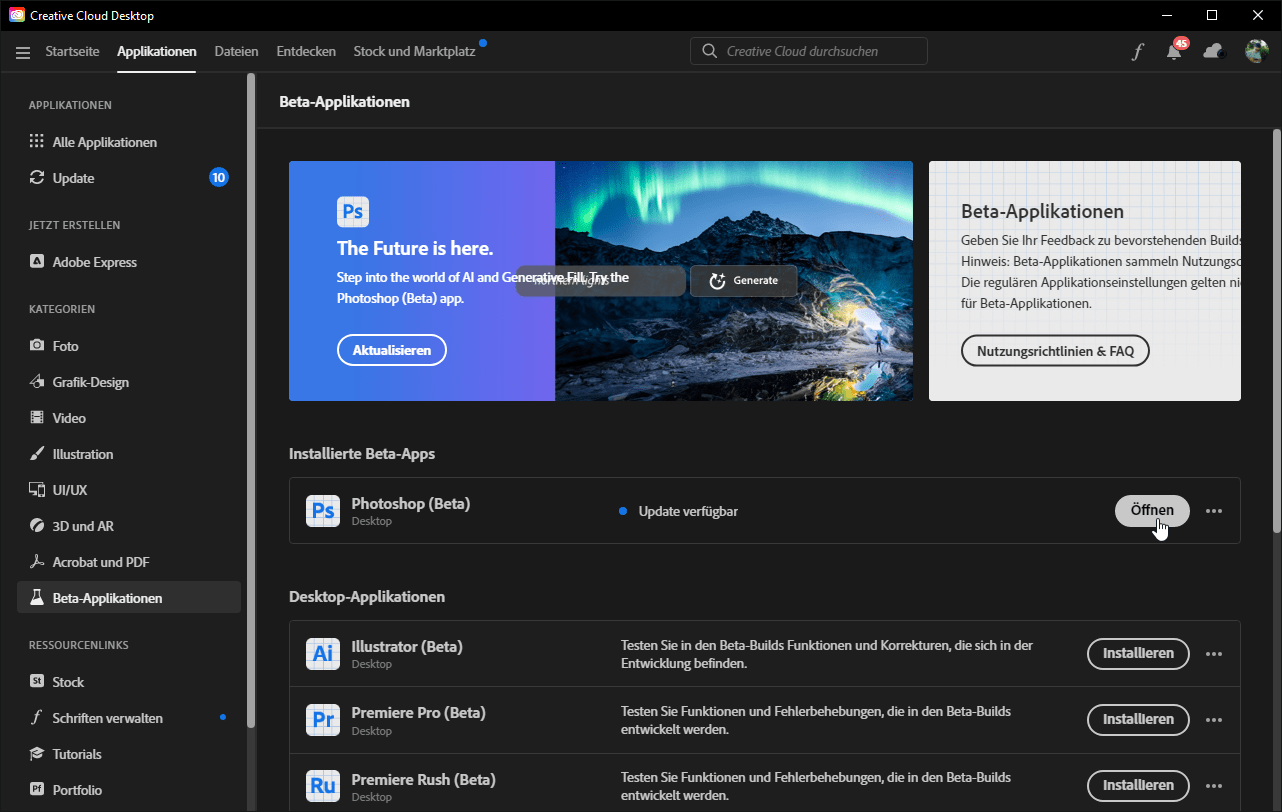 Derzeit befindet sich Generative Fill noch in der Beta-Phase. In der zweiten Jahreshälfte soll es allen Nutzer:innen zur Verfügung stehen. Der Beta-Kanal kann über die Creative Cloud App unter Windows oder macOS aktiviert werden. Dazu startet ihr zunächst die Creative Cloud und wechselt dann auf den Reiter "Anwendungen". In der linken Seitenleiste findet ihr als letzten Eintrag unter "Kategorien" den Punkt "Beta-Apps".