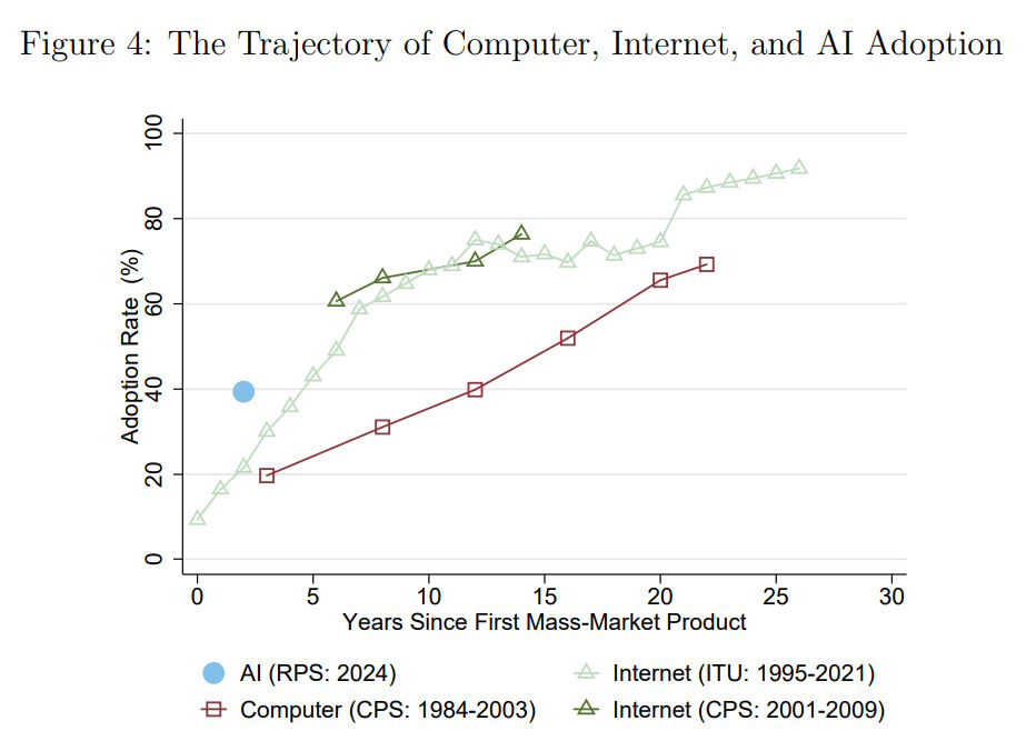 Die Geschwindigkeit der Einführung generativer KI ist beispiellos im Vergleich zu Technologien wie PCs und dem Internet, die die Wirtschaft in früheren Jahrzehnten verändert haben, argumentieren die Autoren der Studie "The Rapid Adoption of Generative AI".