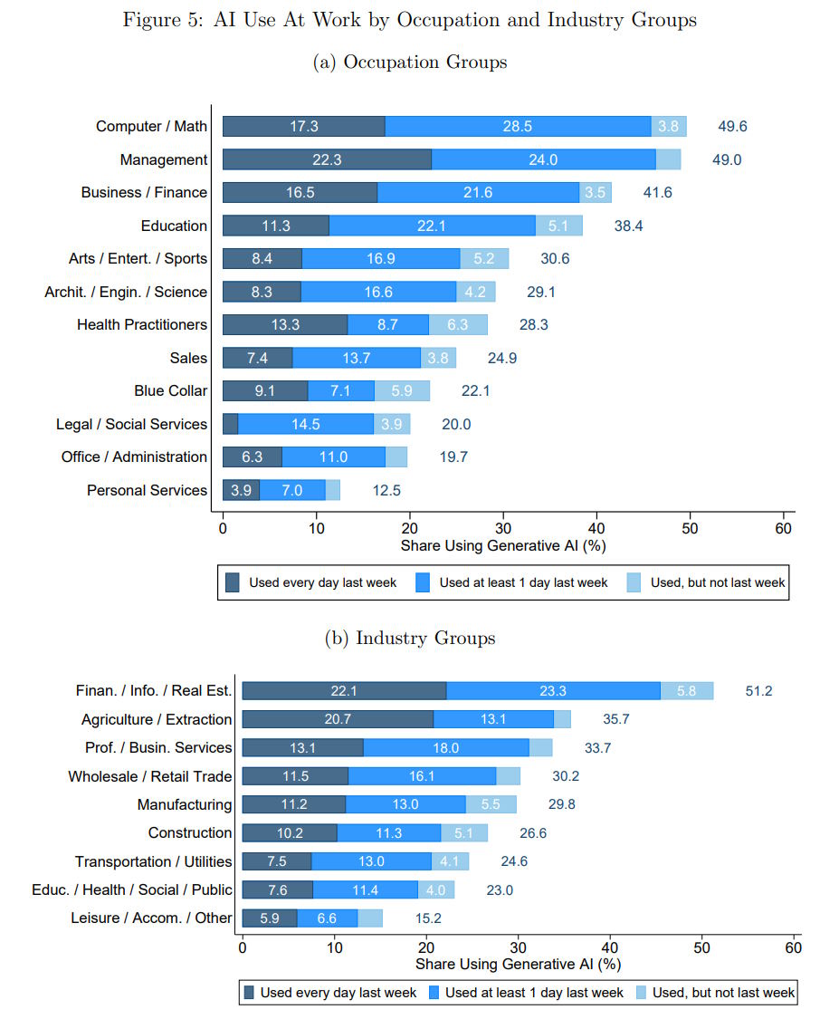 Generative KI wird auch breiter über verschiedene Arten von Arbeitnehmenden und Arbeitsaufgaben hinweg eingesetzt als PCs. Während fast die Hälfte der Arbeitnehmer in Computer- und Managementberufen angab, generative KI zu nutzen, tat dies auch jede:r fünfte Angestellte allgemein.