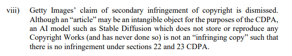 Das Gericht folgte dieser Argumentation nicht. In der Urteilsbegründung heißt es, dass ein KI-Modell wie Stable Diffusion, "das keine urheberrechtlich geschützten Werke speichert oder reproduziert (und dies auch nie getan hat)", keine "rechtsverletzende Kopie" gemäß dem britischen Copyright, Designs and Patents Act (CDPA) darstellt. Obwohl der Begriff "Artikel" im Gesetz auch immaterielle Objekte umfassen kann, sei die Klage unbegründet.