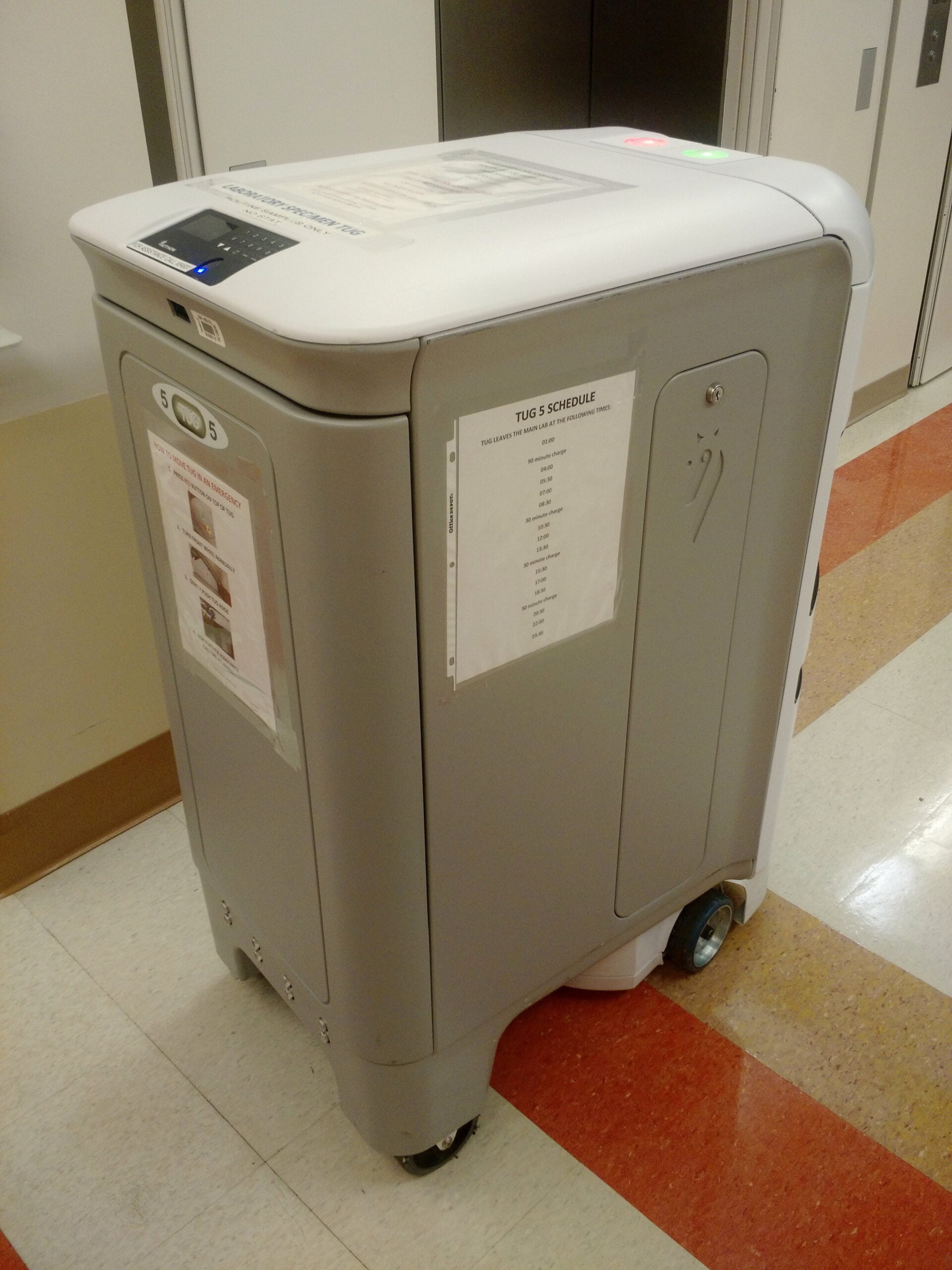 Schon seit über zehn Jahren bevölkern fleißige Maschinenarbeiter wie Tug the Robot Hotels und Krankenhäuser, wo sie Verpflegung, Bettwäsche, Medikamente oder Abfall transportieren. Dabei können sie via WLAN mit automatischen Fahrstühlen, Feuermeldern und Türen kommunizieren und verfügen über rudimentäre Sprachkenntnisse.