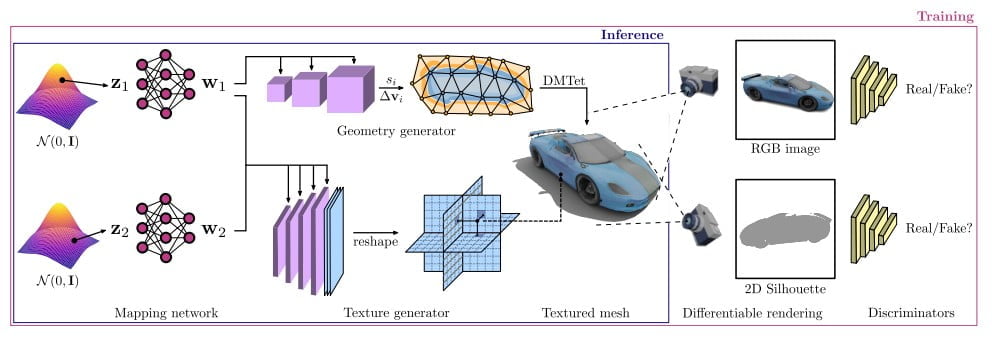 Nvidias Forschungsteam entwickelte einen zweistufigen Generierungsprozess: Der Geometriezweig generiert das Polygonnetz mit beliebiger Topologie. Der Texturzweig erzeugt ein Texturfeld, das an den Oberflächenpunkten des Poylgonnetzes Farben und etwa bestimmte Materialien darstellen kann.