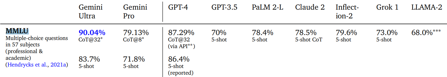 Betrachtet man jedoch im technischen Bericht zu Gemini die MMLU-Zahlen, die Google nicht ins Schaufenster stellt, so zeigt sich, dass Google nur bei einer von zwei Prompting-Methoden GPT-4 übertrifft, nämlich der aufwendigeren (CoT@32). Bei der von OpenAI berichteten Prompting-Methode (5-Shot, fünf Beispiele) schneidet Gemini Ultra schlechter als GPT-4 ab.
