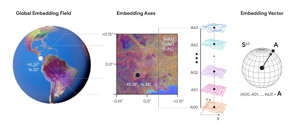 AlphaEarth Foundations charakterisiert laut Deepmind die gesamten Landmassen und Küstengewässer der Erde mit einer Auflösung von 10x10 Metern. Das Modell integriert verschiedene Datenquellen wie optische Satellitenbilder, Radar, 3D-Laser-Mapping und Klimasimulationen in sogenannte Embeddings, kompakte 64-dimensionale Zusammenfassungen, die laut Deepmind besonders dateneffizient sind.