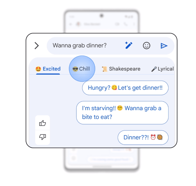 Für Android kündigt Google "Magic Compose" an, eine Art ausführliche Autovervollständigung für Messaging. Die generative KI verwendet dafür den Kontext des Gesprächs und soll auch bestimmte Stile übernehmen kommen, etwa Kommunikation, die nach Business, Shakespeare oder besonders entspannt klingt.