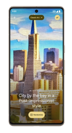 Neu ist auch die Funktion für generative KI-Hintergrundbilder. Der Nutzer kann seine kreative Vision beschreiben, und das Telefon generiert einzigartige Hintergrundbilder mithilfe des Text-zu-Bild-Diffusionsmodells von Google.