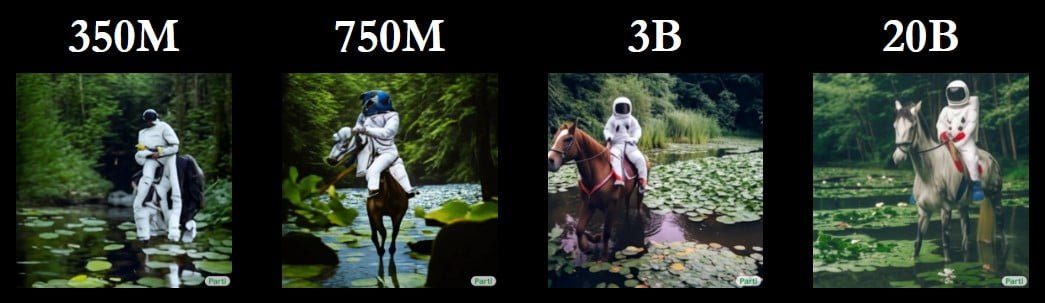 Denn wie bei den großen Sprachmodellen zeigt sich auch bei Parti, dass die Bild-KI mit umfassenderem Training und mehr Parametern deutlich bessere Ergebnisse erzielt. Einfach gesagt: Das KI-Modell skaliert - und wie. Zudem kann es besonders lange, komplexe Texteingaben akkurat in Bilder umsetzen, was für ein noch besseres Verständnis für den Zusammenhang zwischen Sprache und Motiven spricht.