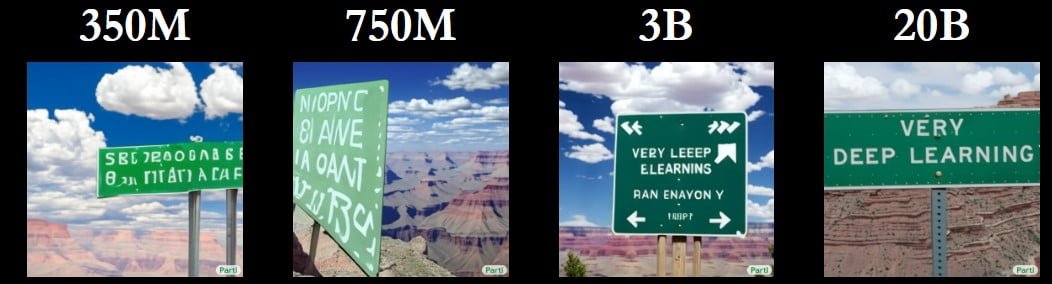 Das Bild oben zeigt den Qualitätsunterschied bei derselben Eingabeaufforderung bei vier unterschiedlich umfangreich trainierten Parti-Modellen. Das größte Modell mit 20 Milliarden Parametern generiert das fehlerfreiste Bild passend zur umfangreichen Texteingabe. Anders als DALL-E 2 kann Parti in der größten Fassung sogar Wörter richtig schreiben ("Welcome Friends").