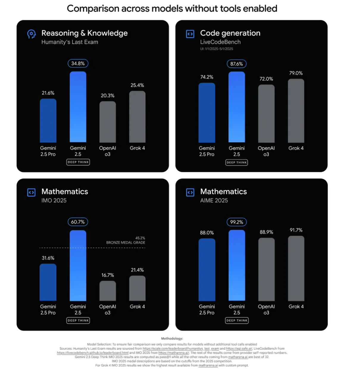 In Benchmarks zeigt Gemini 2.5 Deep Think eine hohe Leistung. Es erreicht bei LiveCodeBench V6 (Code-Generierung) 87,6 % und bei Humanity's Last Exam (Wissen und logisches Denken) 34,8 %, womit es Konkurrenzmodelle wie OpenAI o3 und Grok 4 in Fällen ohne Tool-Use deutlich übertrifft.