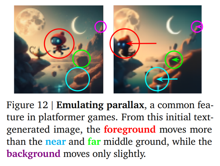 Dabei ist der eigentliche Akteur - also der schwertschwingende Held oder ein Ball in einer handgezeichneten Skizze - nicht festgelegt - das Modell hat durch Training gelernt, welche Elemente in einem Bild üblicherweise Aktionen ausführen und bewegt diese dann selbstständig. Eine weitere spannende Beobachtung: Genie berücksichtigt sogar den so genannten Parallaxeffekt, wenn sich Vorder- und Hintergrund in einem Spiel unterschiedlich schnell bewegen.