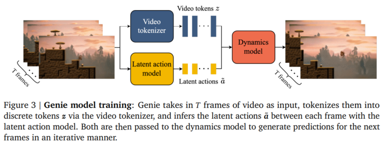 Genie besteht aus drei Komponenten: einem Video-Tokenizer, der Tokens aus Frames generiert, einem Latent Action Model, das Aktionen zwischen Frames vorhersagt, und einem Dynamics Model, das den nächsten Frame des Videos vorhersagt. Für das Latent Action Model beschränkt das Team die Anzahl der vorhergesagten Aktionen auf eine kleine diskrete Menge von Codes, um die menschliche Spielbarkeit zu ermöglichen und die Kontrollierbarkeit weiter zu verbessern.