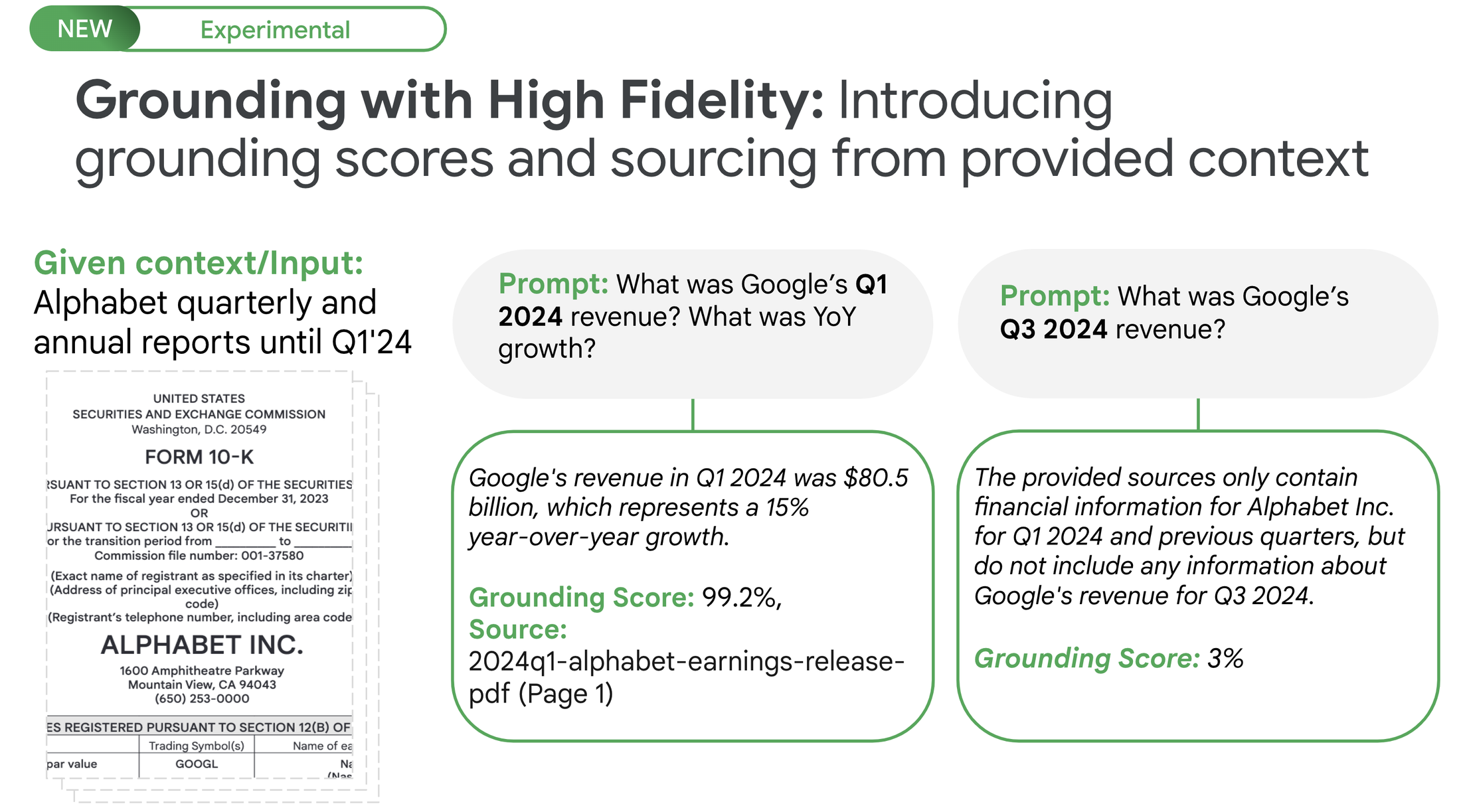 Neu in der Experimental Preview ist der Modus "Grounding with high-fidelity". Diese Funktion der Grounded Generation API soll Halluzinationen weiter reduzieren, indem sie sich bei der Antwortgenerierung ausschließlich auf den bereitgestellten Kontext stützt. Für jeden Satz wird eine Quelle angegeben. Google verwendet hierfür ein nach eigenen Angaben für diesen Zweck fein abgestimmtes Gemini 1.5 Flash Model.