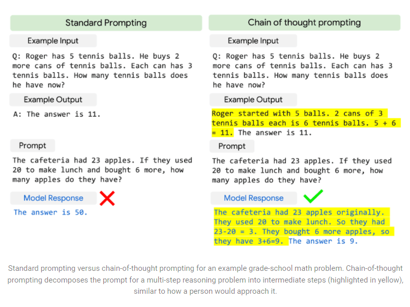 Speziell logische Schlussfolgerungen und ein "generelles Wissen" sollen von einer steigenden Parameteranzahl profitieren. Zeigt man der KI etwa in einem Beispiel den Lösungsweg einer einfachen Textaufgabe auf ("Chain of thought prompting"), kann sie eine vergleichbare Aufgabe eigenständig lösen.