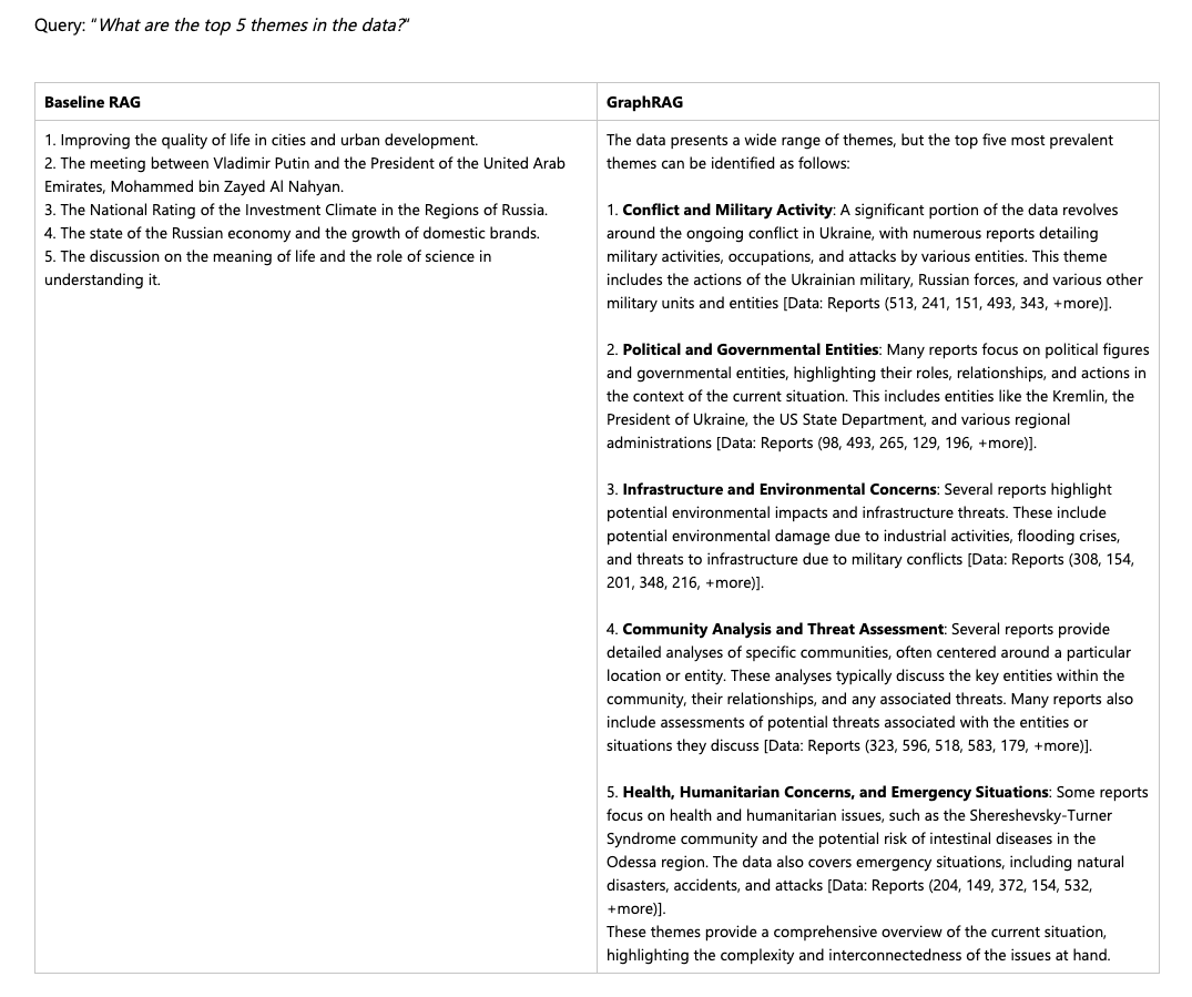 Auch um übergeordnete Themen in einer Datenbasis festzustellen, eignet sich Graph RAG den Tests von Microsoft nach optimal, wie das folgende Beispiel zeigt. Die Antworten sind umfangreicher als bei normalem Vektor-RAG, gleichzeitig ermöglichen Quellenangaben, die Behauptungen leichter zu evaluieren.
