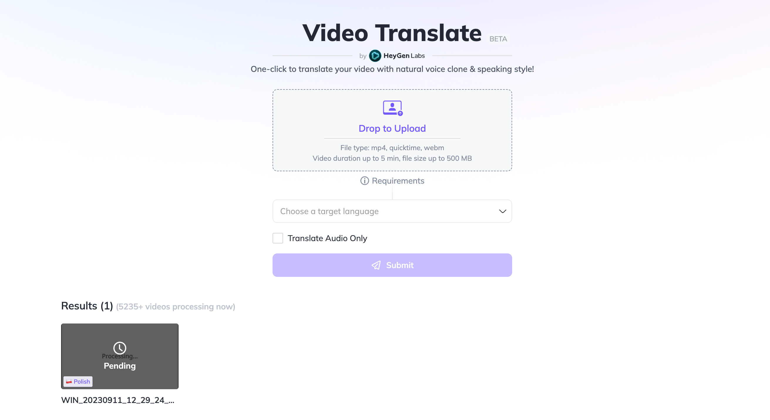 Wir haben ein 47 Sekunden langes Video hochgeladen, das aus dem Deutschen ins Polnische übersetzt werden sollte. Aber auch nach zehn Stunden Bearbeitungszeit waren die Server anscheinend immer noch so überlastet, dass die Übersetzung nicht abgeschlossen werden konnte.