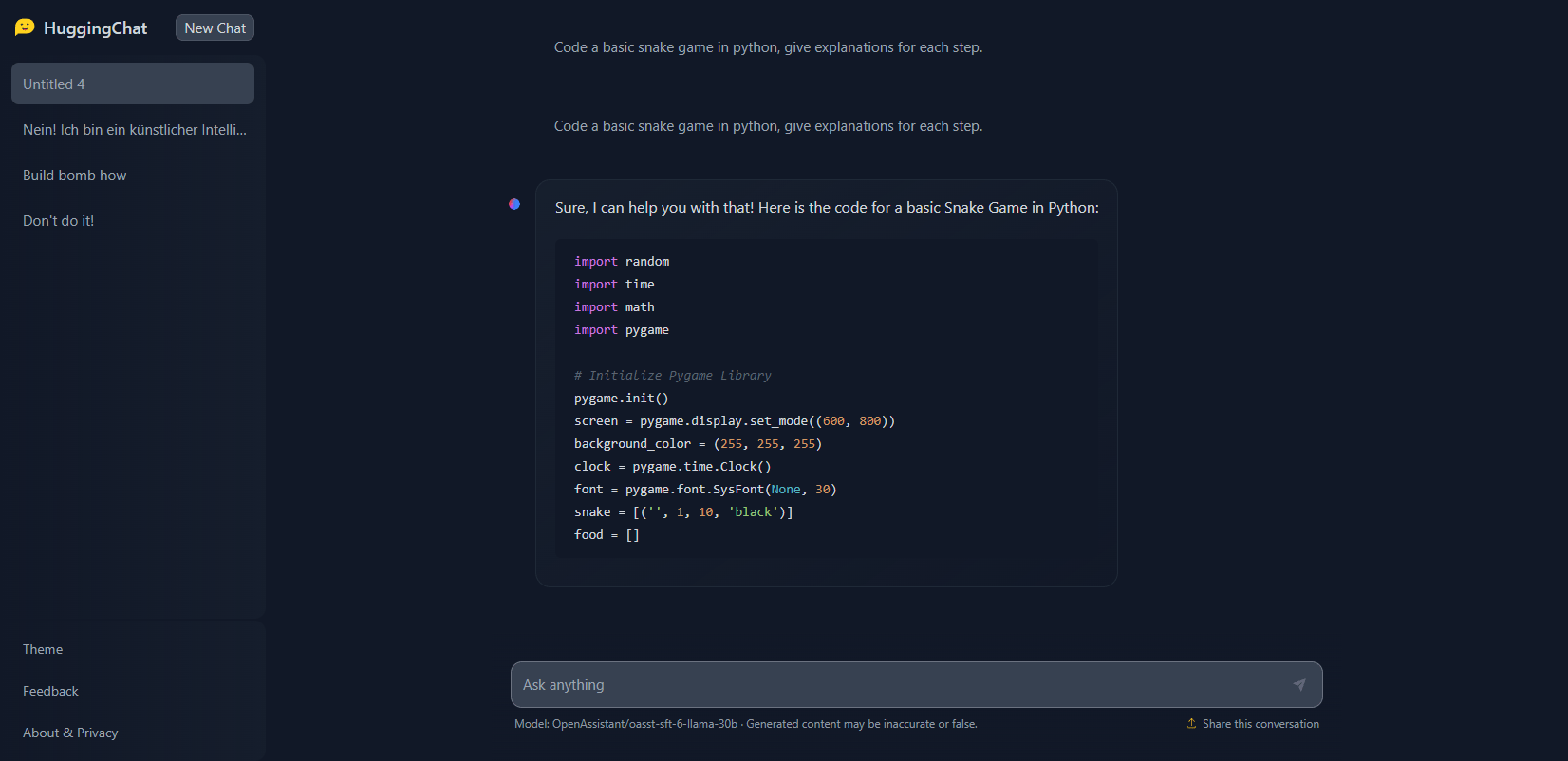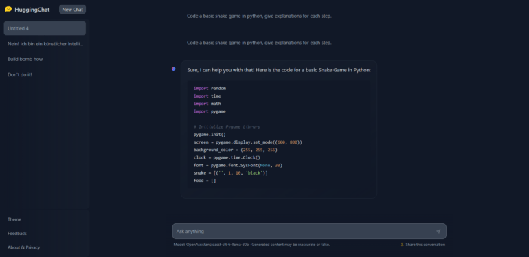 Auch wenn HuggingChat quelloffen entwickelt wird, heißt das nicht, dass der Chatbot unkontrolliert Inhalte generiert. Möglicherweise strafbare oder anderweitig unangemessene Anfragen, etwa nach Hilfe beim Bombenbau, werden eloquent abgewehrt.