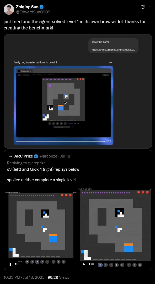 Die "Developer Preview" enthält drei interaktive Testspiele, die laut den Entwicklern von Menschen in wenigen Minuten gelöst werden können – aktuelle KI-Systeme erzielen jedoch durchweg null Punkte. OpenAI-Forscher Zhiqing Sun behauptet allerdings auf X, dass der neue ChatGPT Agent das erste Spiel bereits lösen kann.