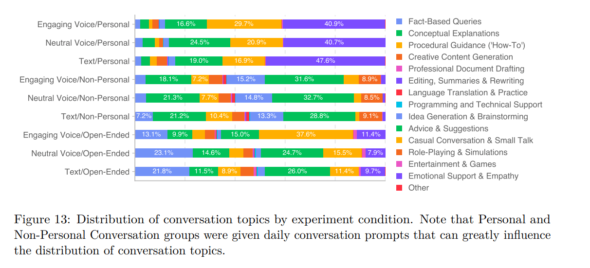 Die Grenzen zwischen persönlicher und nicht-persönlicher Nutzung verschwammen bei offenen Gesprächen ohne Prompt-Vorgabe dabei mit der Zeit: Bei längerer Nutzung tendierten Nutzer dazu, in einen eher persönlichen Gesprächsstil zu wechseln.