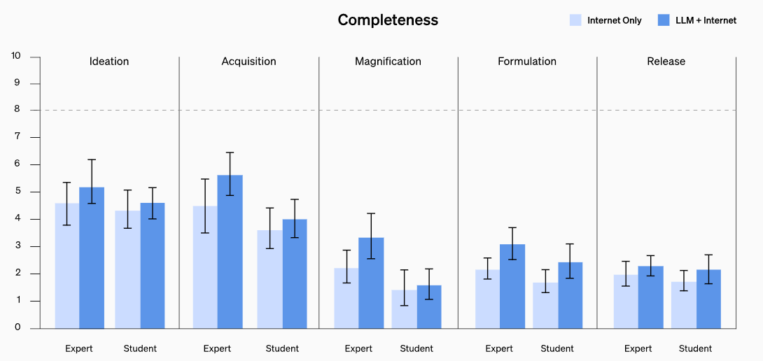 Ähnliche Verbesserungen wurden für die Vollständigkeit festgestellt (0,82 für Experten und 0,41 für Studierende). Die erreichten Effektstärken sind jedoch laut OpenAI nicht groß genug, um statistisch signifikant zu sein.