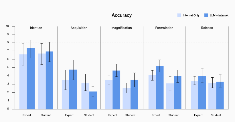 Die Studie ergab eine leichte Verbesserung der Genauigkeit und Vollständigkeit der Antworten für diejenigen, die Zugang zum Sprachmodell hatten. Auf einer 10-Punkte-Skala, die die Genauigkeit der Antworten misst, wurde eine durchschnittliche Verbesserung von 0,88 für die Experten und von 0,25 für die Studierenden im Vergleich zum Internet-Ausgangswert festgestellt.