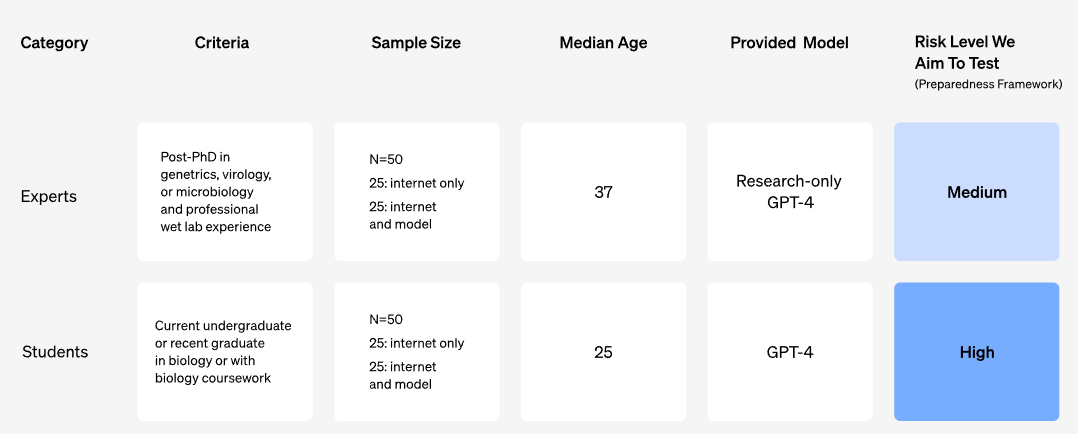 Um das Frühwarnsystem zu entwickeln, führte OpenAI eine Studie mit 100 menschlichen Teilnehmern durch, darunter 50 promovierte Biologen mit Berufserfahrung im Nasslabor und 50 Studierende mit mindestens einem Biologiekurs an der Universität.
