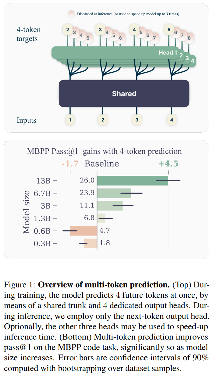 Konkret sagt das Modell an jeder Stelle des Trainingstextes die nächsten Wörter parallel voraus, indem es einen gemeinsamen Modellteil (Trunk) und mehrere unabhängige Ausgabeköpfe (Output Heads) verwendet. Im Vergleich zum herkömmlichen Verfahren kann so die Trainingseffizienz gesteigert werden.