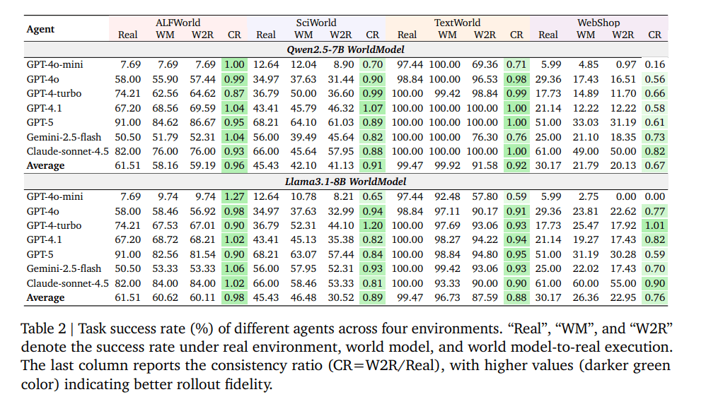 Diese Auswahl deckt sowohl strukturierte Domänen mit klaren Regeln als auch offene Umgebungen mit hoher Variabilität ab. Die Forscher bewerteten die Weltmodelle auf drei Ebenen: Wie präzise und konsistent sagen sie Zustandsübergänge vorher, auch über längere Abläufe hinweg? Wie gut skalieren diese Fähigkeiten mit mehr Daten und größeren Modellen, und wie robust bleiben sie unter veränderten Bedingungen? Und wie nützlich sind die Weltmodelle tatsächlich für das Training von Agenten?