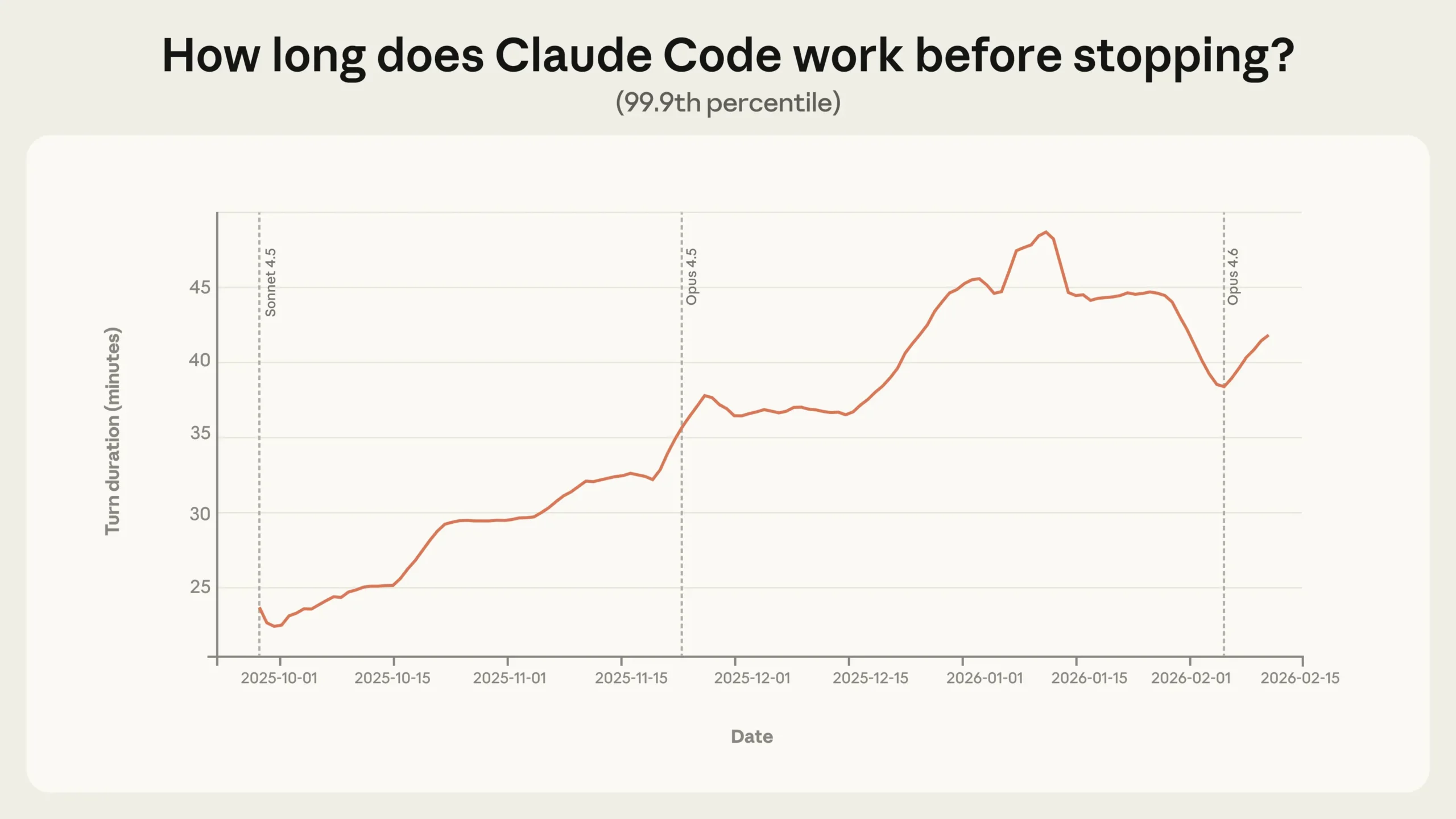Die vielleicht auffälligste Erkenntnis betrifft die Dauer, die Claude Code ohne menschliches Eingreifen arbeitet. Während der Median bei rund 45 Sekunden pro Arbeitsschritt liegt und relativ stabil geblieben ist, hat sich das 99,9-Perzentil zwischen Oktober 2025 und Januar 2026 fast verdoppelt: von unter 25 Minuten auf mehr als 45 Minuten.