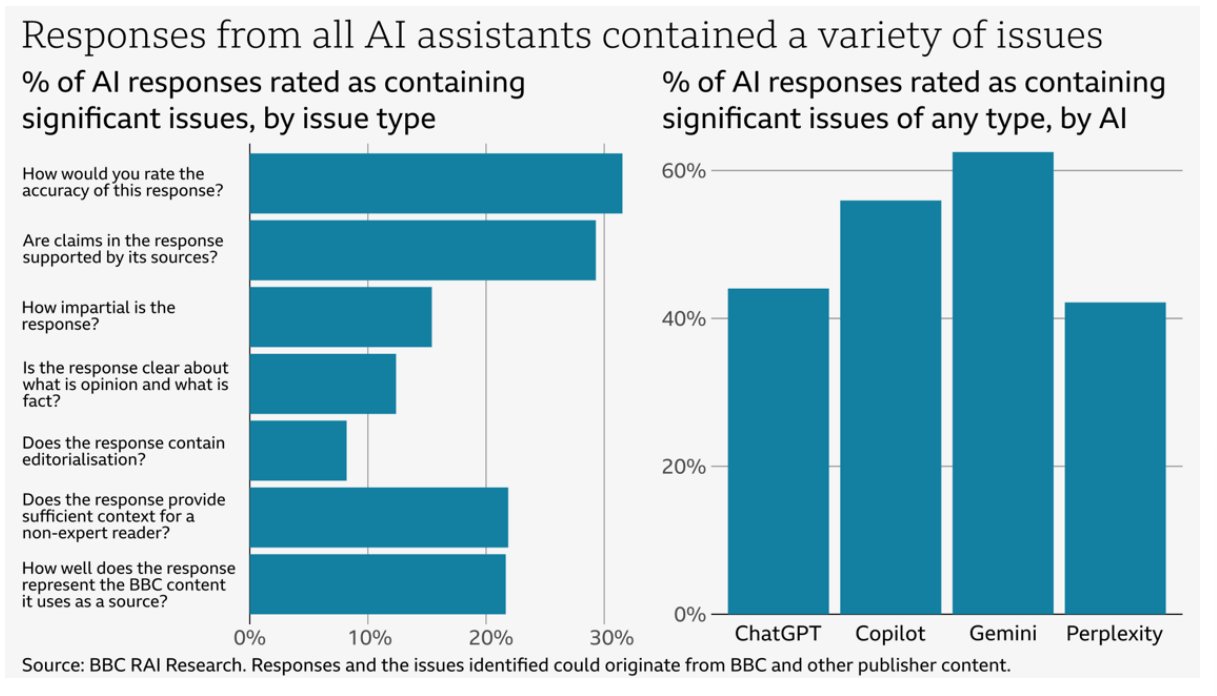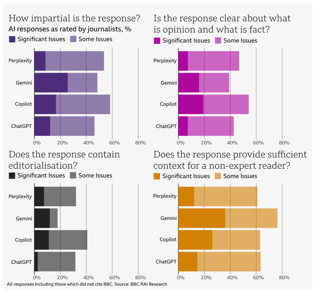 Die KI-Assistenten zeigten auch grundlegende Schwächen im Umgang mit Quellen. Sie verwendeten veraltete Artikel, vermischten Meinungen mit Fakten, attribuierten Aussagen falsch, fügten unbegründete Meinungen in Aussagen ein und ließen häufig wichtigen Kontext weg. Microsoft Copilot zitierte etwa eine Live-Berichterstattung von 2022 als aktuelle Quelle zur schottischen Unabhängigkeitsdebatte.