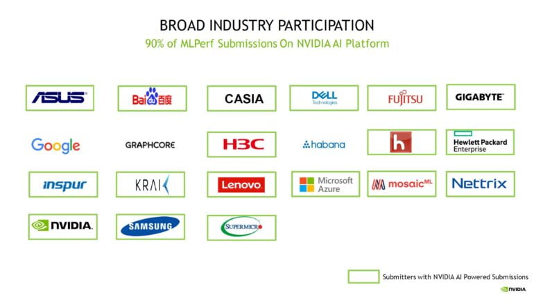 Zu den teilnehmenden Unternehmen zählen Chip-Hersteller wie Nvidia, Google, Graphcore oder Intels Habana Labs sowie Server-Hersteller wie Inspur, Fujitsu oder Lenovo. Am diesjährigen MLPerf-Trainingsbenchmark 2.0 nahmen insgesamt 24 Unternehmen mit ihren Produkten teil.