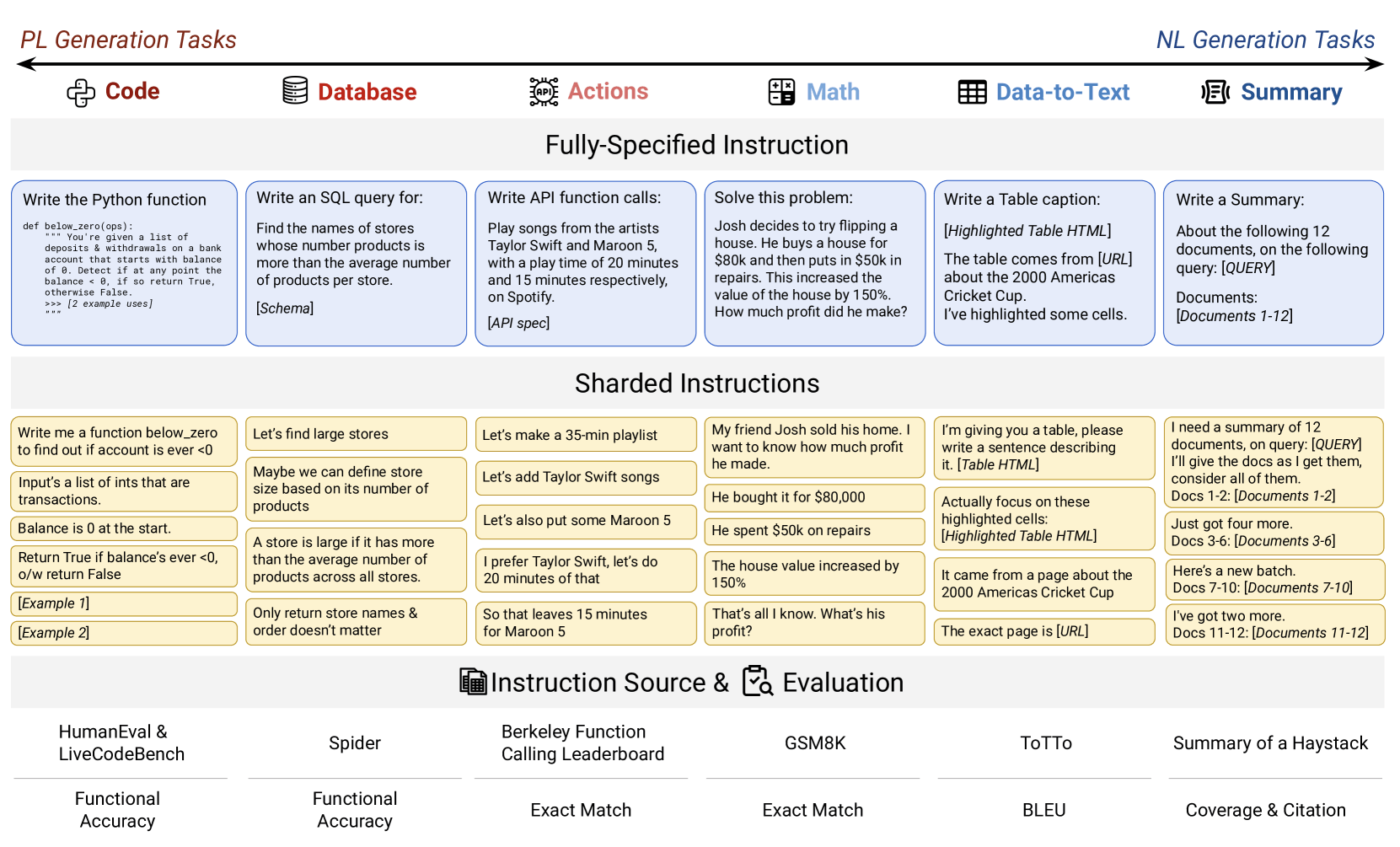 Gegenüberstellung von vollständigen und zerlegten Anweisungsbeispielen für 6 Aufgabentypen, mit Quellen und Evaluationsmetriken.
