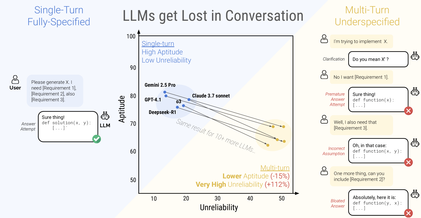 Auch die fortschrittlichsten getesteten Modelle wie Claude 3.7 Sonnet, Gemini 2.5 Pro und GPT-4.1 schnitten in Mehrfachrunden-Gesprächen um 30-40 Prozent schlechter ab als in Einzelrunden. Zudem verdoppelte sich die Unzuverlässigkeit der Modelle im Durchschnitt, wobei die Ergebnisse deutlich stärker schwanken als bei Einzelrunden-Gesprächen.