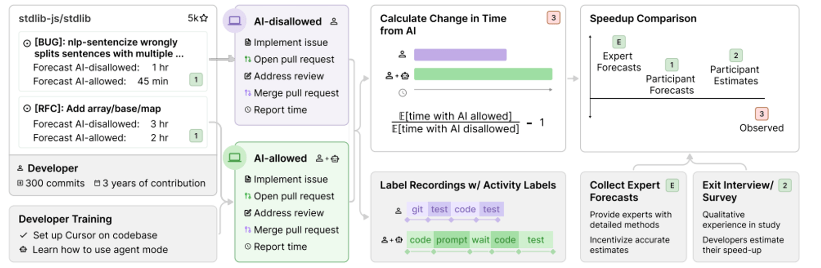 Das Herzstück der Studie bildeten 16 erfahrene Entwickler, die 246 reale Aufgaben aus ihren eigenen, komplexen Open-Source-Projekten bearbeiteten. Noch bevor die eigentliche Arbeit begann, wurde die Erwartung der Entwickler erfasst: Sie schätzten, dass der Einsatz von KI ihre Arbeit um beachtliche 24 Prozent beschleunigen würde.